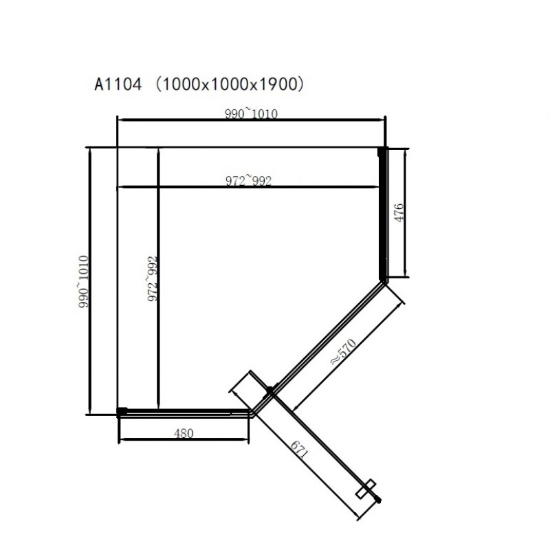 Душова кабіна Dusel А-1104 п'ятикутна, має одні розпашні двері на металевих петлях. У кабіни універсальне розташування двері (можливий як лівобічний, так і правобічний монтаж)